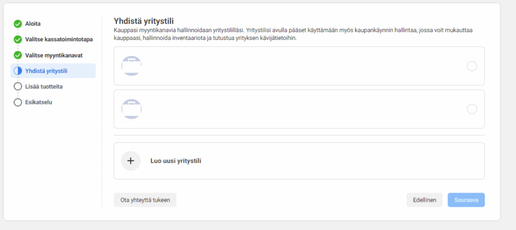 6. Yhdistä yritystilisi siihen tiliin, johon haluat luoda kaupan tai luo uusi.
