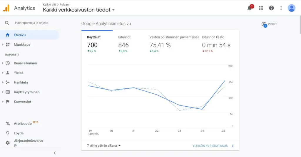 Seuraavaksi käymme läpi Google-analytiikan muut välilehdet ja suosituimmat raportit, joiden avulla pääset hyvin alkuun web-analytiikan hyödyntämisessä: