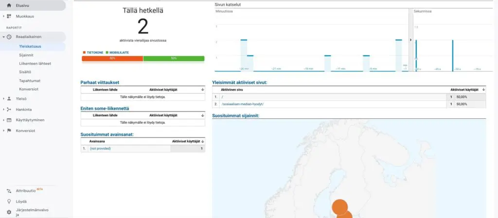 Kuten saatat arvata, reaaliaikainen-välilehti kertoo, kuinka paljon sivustollasi on kävijöitä juuri nyt. Millä sivulla he ovat, missä he ovat maantieteellisesti ja millä laitteella he surffaavat verkossa.