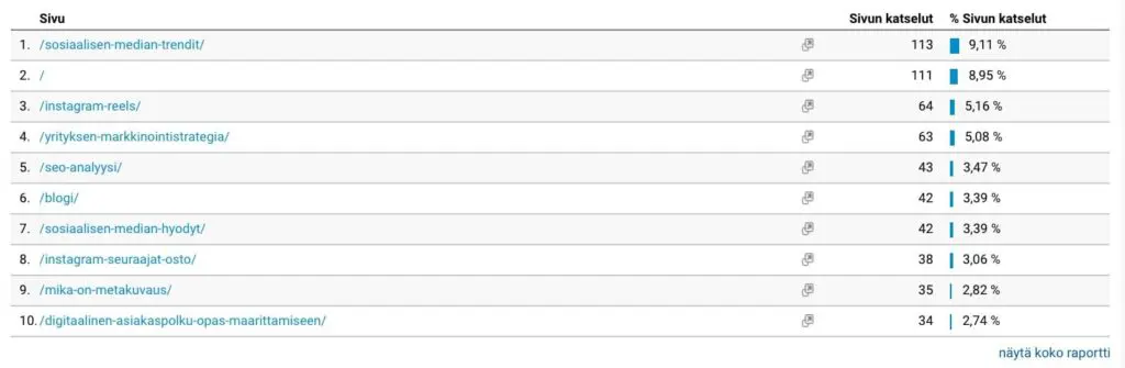 - Mitkä ovat sivustosi suosituimmat sivut käyttäjämäärän mukaan?