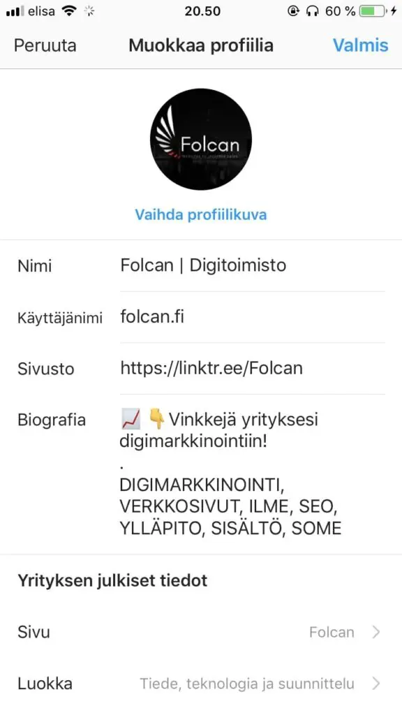 Tästä huolimatta haluat kuitenkin hyödyntää tämän “sivusto”-kohdan yritystilisi biossa. Tämä on helppo tapa ohjata liikennettä haluamaasi kohteeseen, kuten esimerkiksi yrityksesi verkkosivuille.