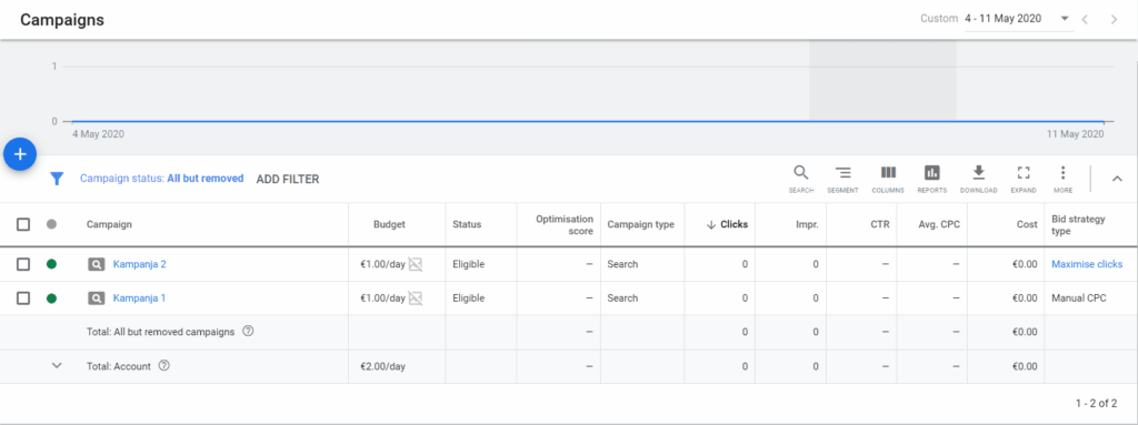 Nyt oletkin jo siellä, missä tärkein mainoskampanjoiden data sijaitsee. Alla näet niin aktiiviset kuin epäaktiiviset kampanjasi (merkitty samassa järjestyksessä vihreällä ja harmaalla pallolla). Kampanjan kohdalla rivissä on erilaisten otsikoiden määrittämää dataa. Tästä näkee useimmat mainonnan KPI:t. Aivan alhaalta löytyy myös kaikki kampanjat huomioiva kokonaisdatarivi, joka kertoo kunkin KPI:n yhteenlasketut arvot, eli laskee kaikkien kampanjoidesi datan yhteen.