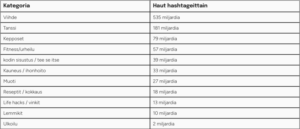 Suosituimmat kategoriat ja hashtagihaut (vuonna 2022):