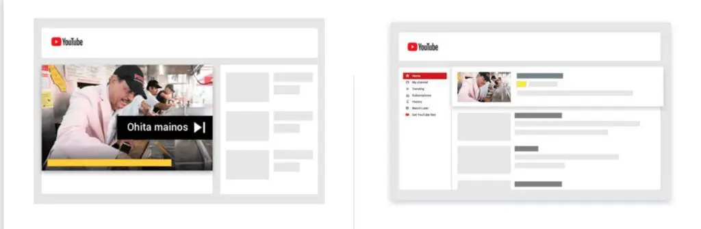 • TrueView Video Discovery ‑mainokset näytetään itse videosisällön sijasta videon ympärillä. Niitä voi nähdä YouTuben etusivulla, hakutulosten joukossa listauksen alussa sekä videon katselusivulla sisällön vierellä. Tässä mainosmuodossa maksetaan vain siitä, että käyttäjä klikkaa mainosta. Video Discovery -mainos voi koostua mainostekstistä sekä kuvasta. Klikkaamalla mainosta voidaan päästä esimerkiksi yrityksen kotisivuille.